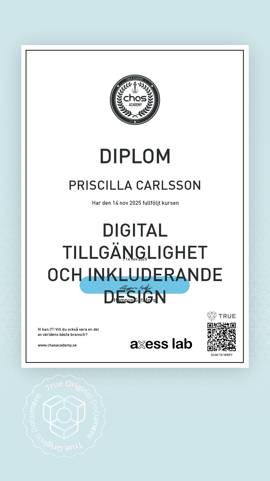 Alla TRUE -document är säkrade med blockchain-teknologi och kan verifieras som äkta. Klicka på verifieringsknappen bredvid dokumentet eller skanna QR-koden med din smartphones kamera. Ingen app krävs - dokumentets äkthet verifieras omedelbart.