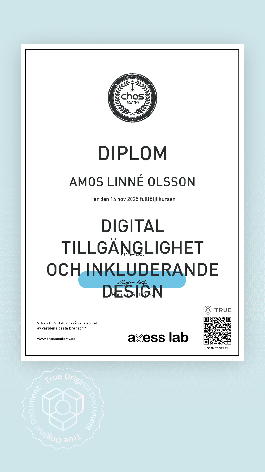 Alla TRUE -document är säkrade med blockchain-teknologi och kan verifieras som äkta. Klicka på verifieringsknappen bredvid dokumentet eller skanna QR-koden med din smartphones kamera. Ingen app krävs - dokumentets äkthet verifieras omedelbart.